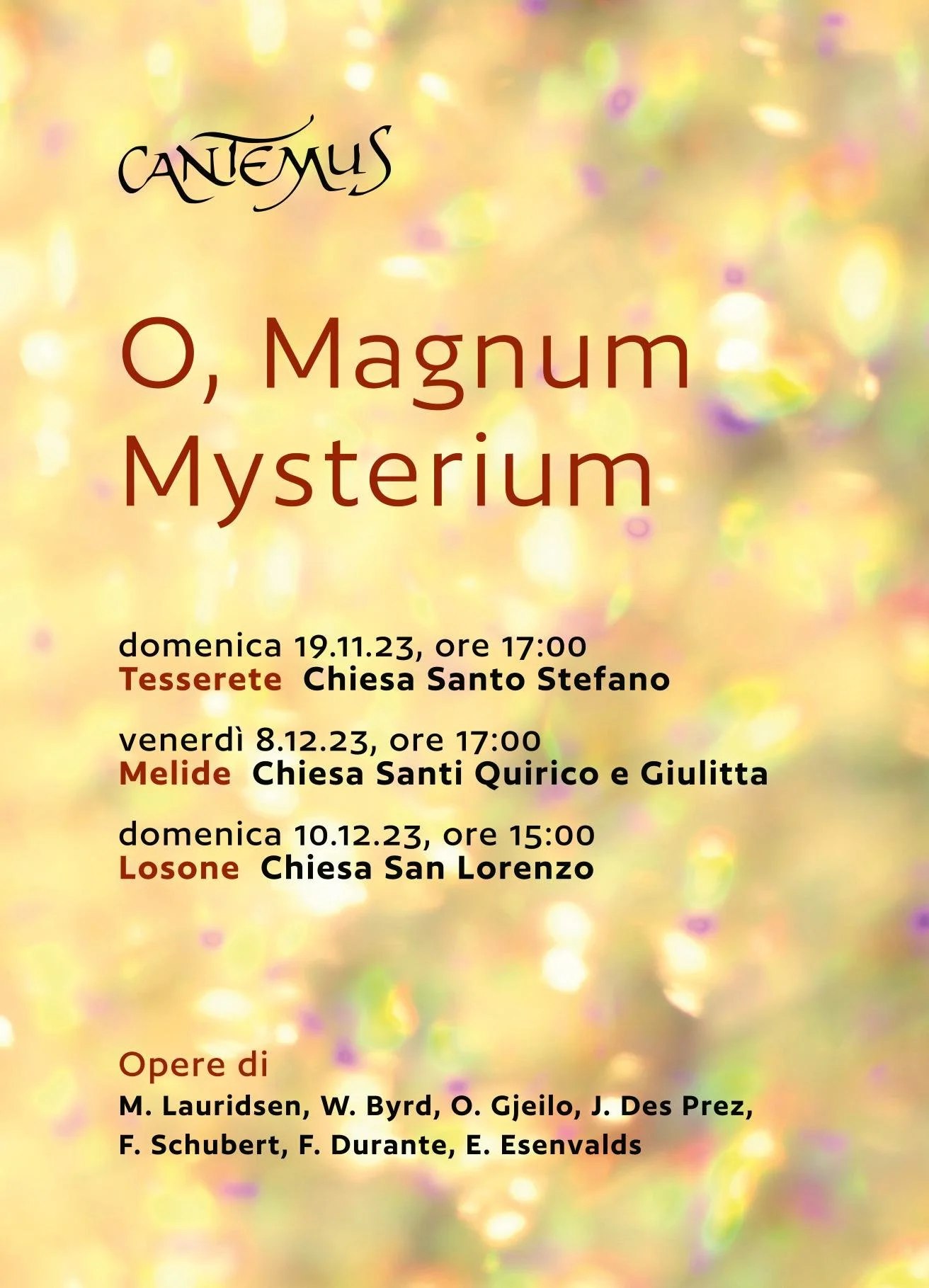 Domenica 19 novembre ore 17:00 presso la Chiesa Santo Stefano di Tesserete si terrà il concerto Cantemus O, Magnum Mysterium, opera di M. Lauridsen, W. Byrd, O. Gjeilo, J. Des Prez, F. Schubert, F. Durante, E. Esenvalds