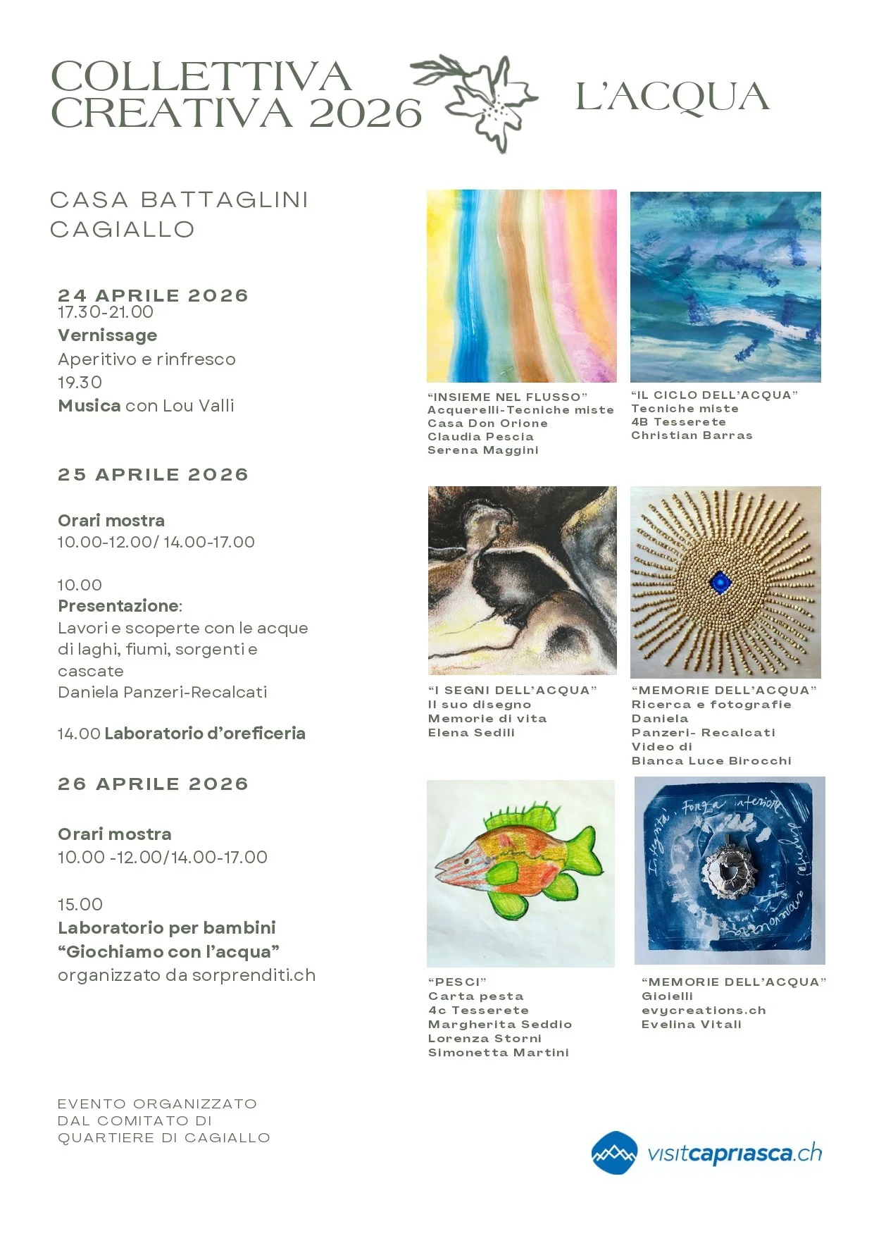 L’ufficio cultura, eventi, sport e turismo comunica che da venerdì 24 a domenica 26 aprile, presso la Casa Battaglini a Cagiallo, il Comitato di Quartiere di Cagiallo organizzerà una Collettiva Creativa ricca di attività e proposte ispirate al tema dell’acqua.