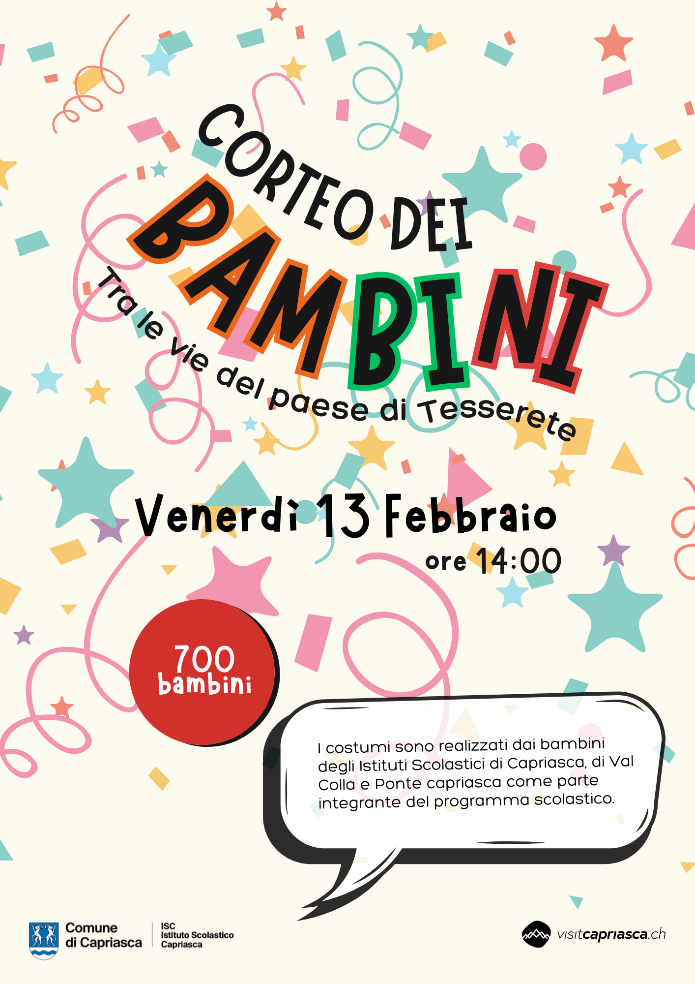 Venerdì 13 febbraio alle ore 14:00 oltre 700bambini sfileranno tra le vie del paese di Tesserete con i costumi da loro stessi realizzati come parte integrante del programma degli Istituti scolastici di Capriasca, Val Colla e Ponte Capriasca.