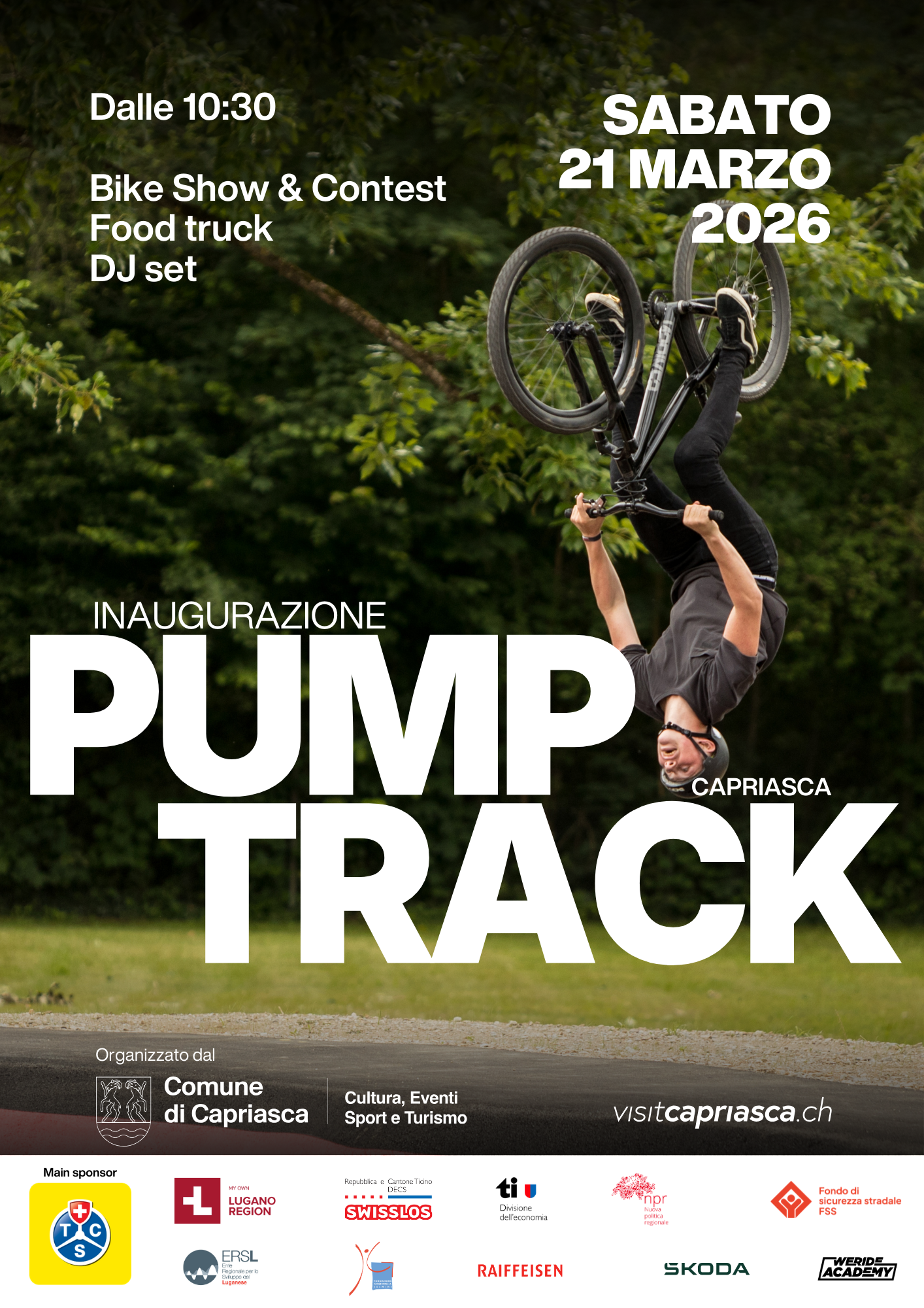 Sabato 21 marzo alle ore 10:30, presso il Centro sportivo a Tesserete, in Via Contessa Grassa 2, sarà inaugurata la nuova area Pumptrack, quale ulteriore tappa di sviluppo del progetto Bike Park Capriasca. L’evento prenderà avvio con la parte ufficiale, alla presenza delle autorità comunali e dei partner di progetto, cui seguirà un rinfresco offerto e momenti di intrattenimento sportivo e conviviale aperti a tutte le persone presenti.