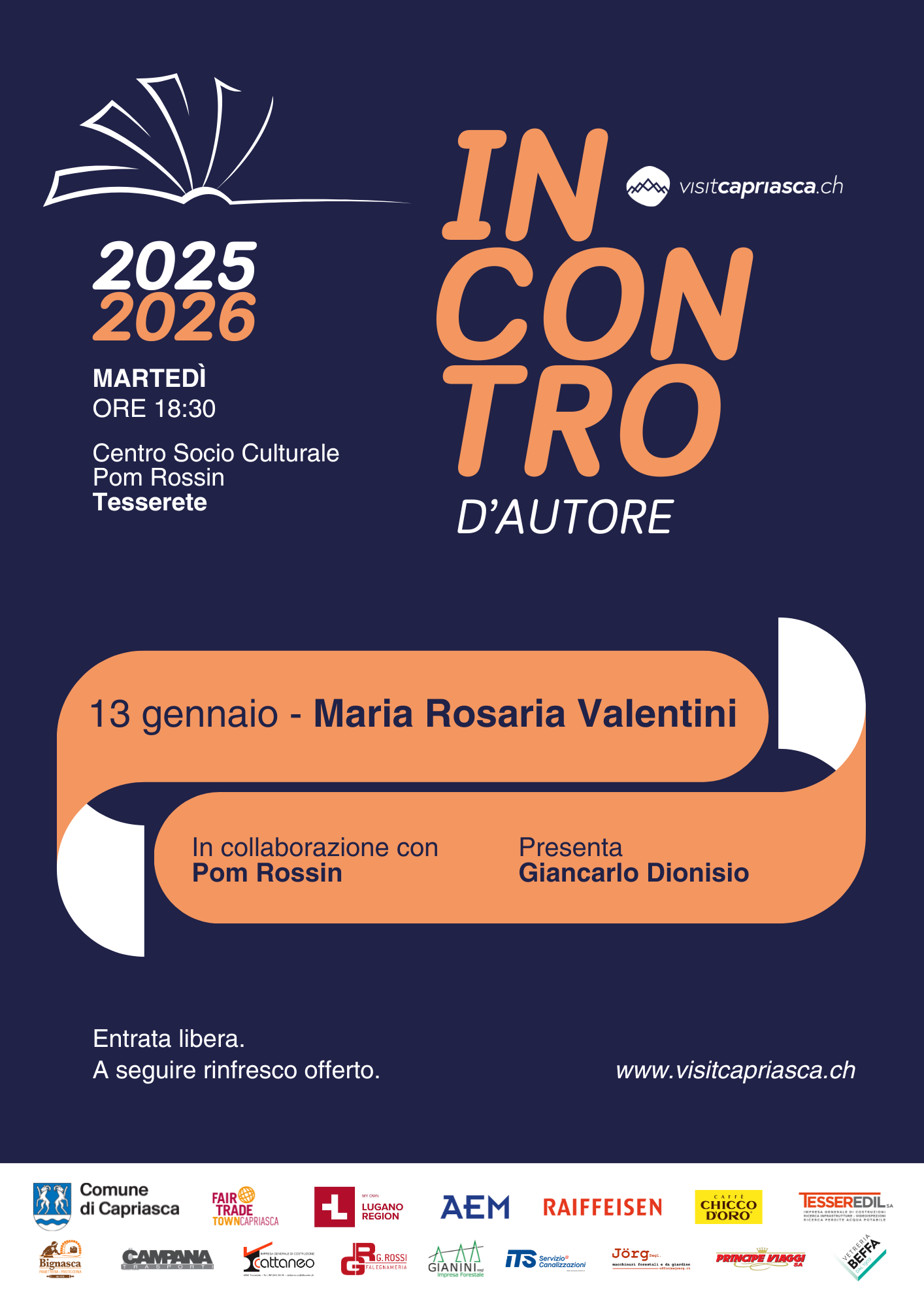 Martedì 13 gennaio alle ore 18:30, presso il Centro socio culturale Pom Rossin, Giancarlo Dionisio presenta l’autrice Maria Rosaria Valentini.