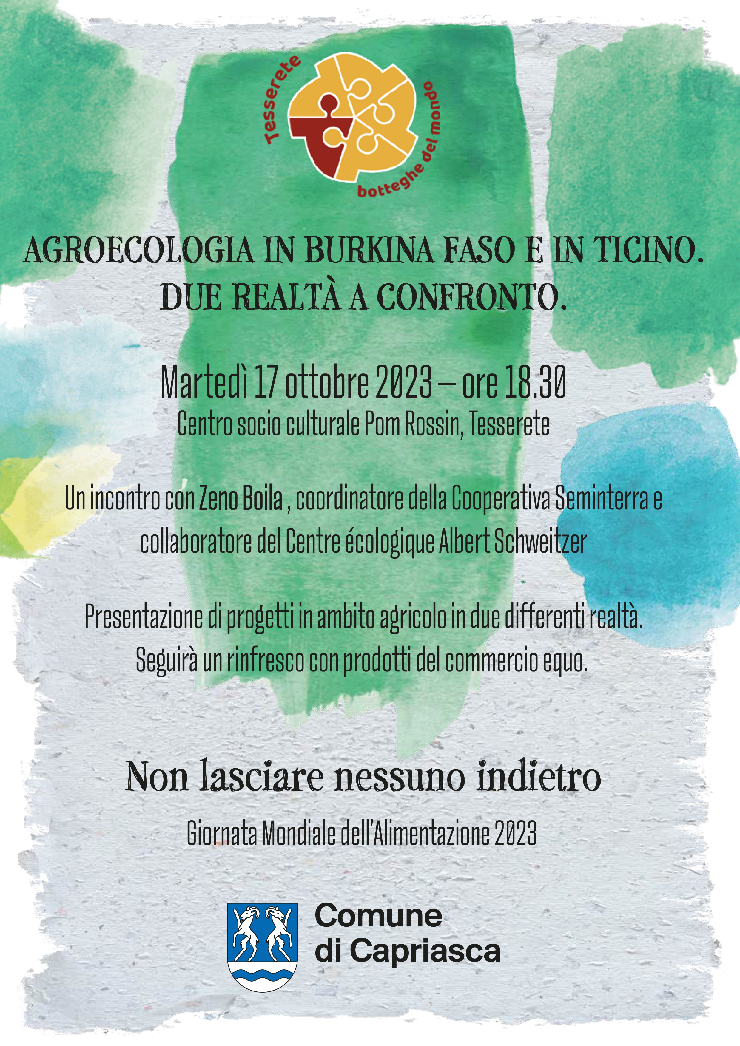 In occasione della Giornata Mondiale dell’Alimentazione la BdM di Tesserete in collaborazione con la commissione Fair Trade Town del Comune di Capriasca organizza martedì 17 ottobre un incontro con Zeno Boila, coordinatore della Coopertiva agricola Seminterra e membro attivo dell’Associazione Beogo. Boila parlerà di alcuni progetti in ambito agricolo in Burkina Faso e in Ticino. Seguirà un aperitvo.