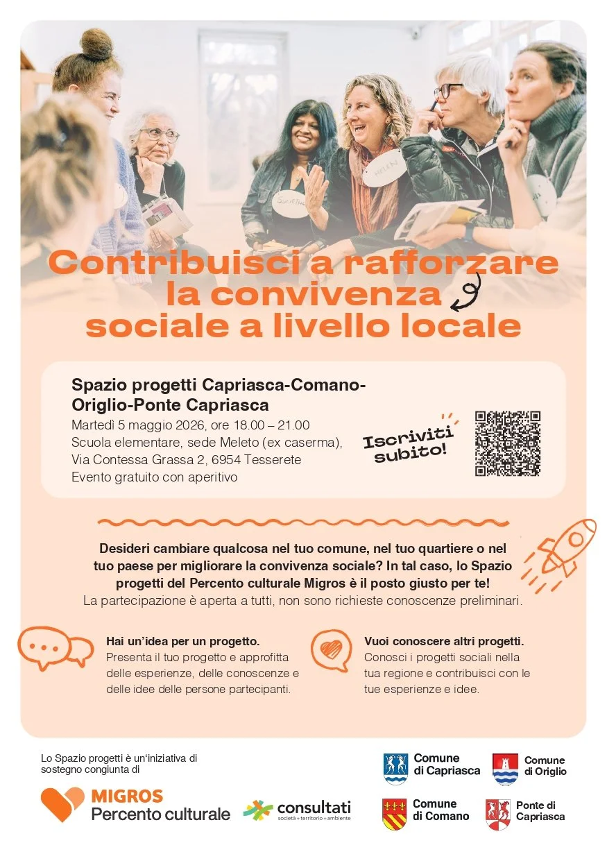 Per motivi organizzativi, si chiede di confermare la propria partecipazione completando il formulario di iscrizione al link: https://engagement.migros.ch/it/percento-culturale/affari-sociali/spazio-progetti/spazio-progetti-capriasca
